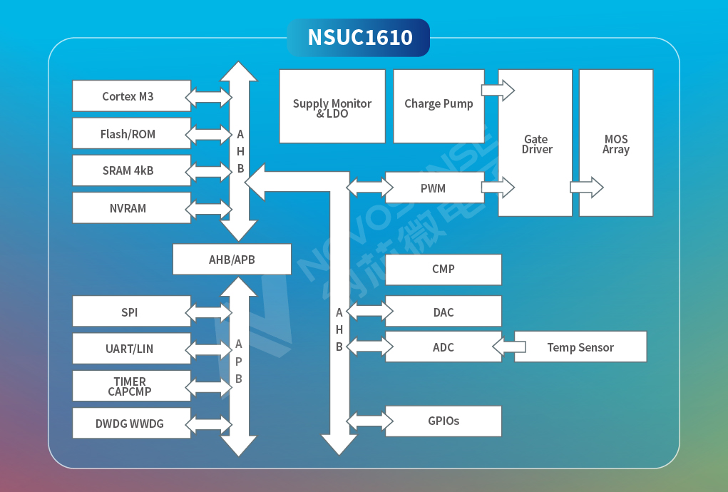 得益于以上优势,NSUC1610支持12V汽车电池供电,适合于直接控制小型有刷直流电机(BDC)、无刷直流电机(BLDC)和步进电机的应用,有助于客户减小PCB尺寸,简化生产设计,实现更高效、更紧凑以及高性价比的电机控制应用设计。