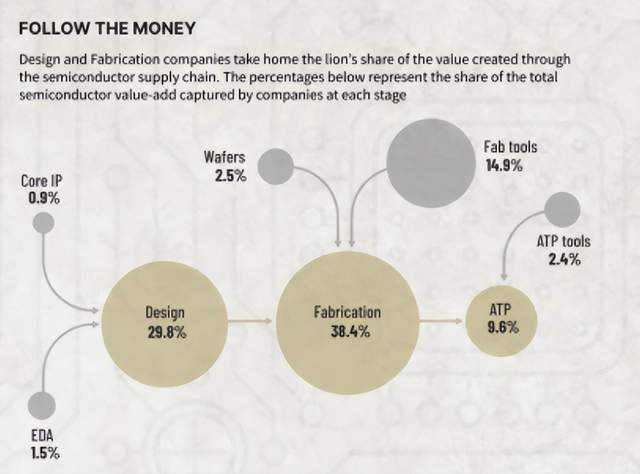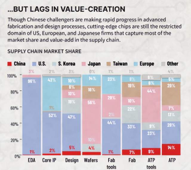 但是,在整个芯片的产业链中□▪,最具价值的是设计占29.8%,而制造占38□….4%•,半导体设备占14.9%,而在这些最具价值的领域,中国的表现不如美国等强国,那确实是由美国、欧洲、日本和韩国公司垄断,他们攫取了大部分的价值和市场。