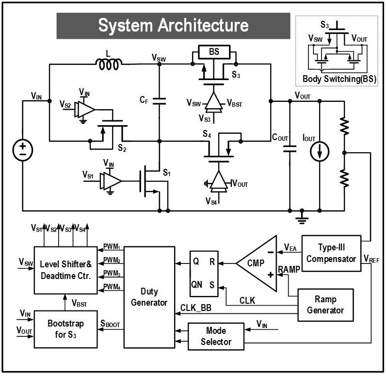 现有的Buck-Boost转换器通过引入飞电容减少功率路径上的功率管数量来降低导通损耗◆◆•,但同时也导致了功率管的耐压问题▼▲,限制了效率的提升△;为了克服耐压问题★,一些工作又引入更多的功率管和飞电容□◆▷,增加了成本并且降低了芯片的电流密度。随着移动电子设备集成的功能越来越多,负载电流越来越大●▼•,现有Buck-Boost结构在效率与电流密度之间的折中愈发挑战△◁▽。