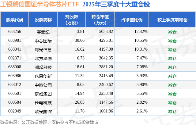 12月24日工银瑞信国证半导体芯片ETF基金份额减少300万份,重仓股寒武纪、中芯国际、海光信息