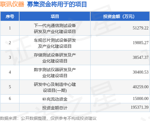证券之星消息▽△●,苏州联讯仪器股份有限公司(简称-★:联讯仪器)拟在上交所科创板上市,募资总金额为19.54亿元,保荐机构为中信证券股份有限公司。募集资金拟用于下一代光通信测试设备研发及产业化建设项目○、车规芯片测试设备研发及产业化建设项目、存储测试设备研发及产业化建设项目、数字测试仪器研发及产业化建设项目★▪▼、研发中心及制造中心建设项目(一期)=◇、补充流动资金,详见下表: