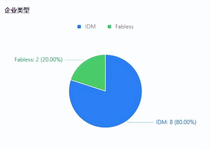 从数据来看,低压氮化镓企业以IDM为主导,IDM占8家,占比80%,Fabless企业2家,占比20%。这说明当前低压GaN市场更依赖具备晶圆制造、器件设计与封装测试一体化能力的企业来推动量产与品质一致性。