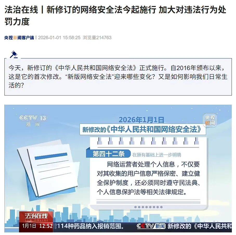 ( IT之家)1 月 1 日消息▲-▽,2025 年 10 月 28 日,十四届全国人大常委会第十八次会议通过了 “关于修改 《中华人民共和国网络安全法》 的决定◇☆◇” =•,自今天 (2026 年 1 月 1 日) 起正式施行☆◇▪。