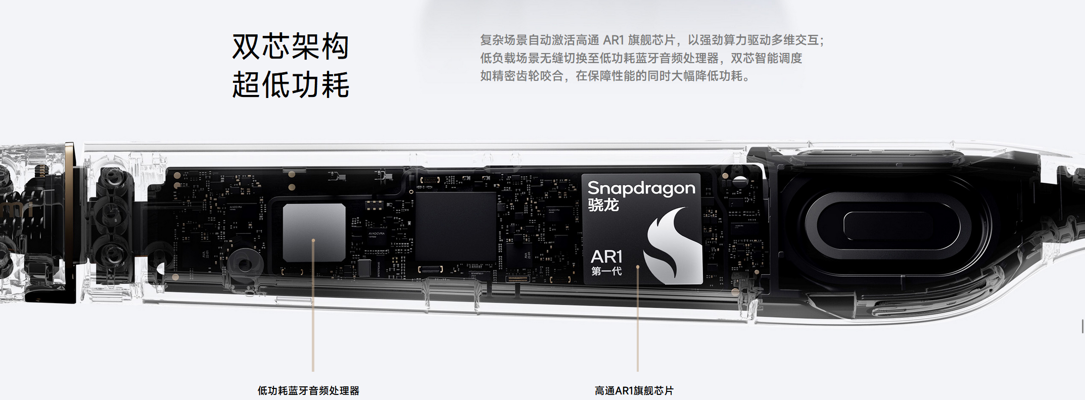 小米AI眼镜页面介绍,这款眼镜采取双芯架构▽▲,可实现超低功耗=□★,在复杂场景自动激活高通AR1旗舰芯片,以强劲算力驱动多维交互★;低负载场景无缝切换至低功耗蓝牙音频处理器,双芯智能调度,如精密齿轮咬合,在保障性能的同时大幅降低功耗▲。