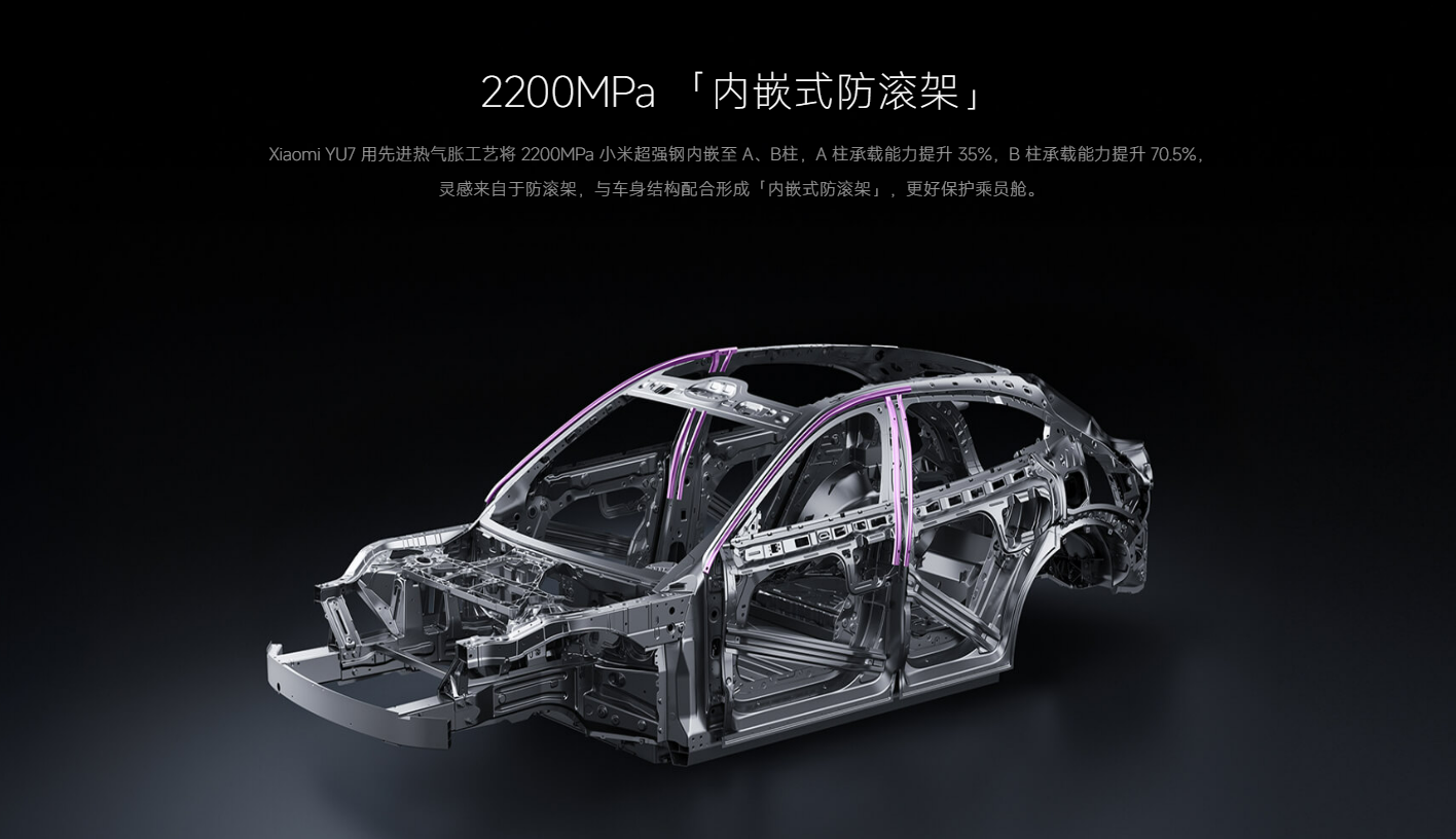 对于2200MPa小米超强钢,小米汽车此前介绍○,△“2200MPa 小米超强钢”是目前行业量产最高强度的热成型钢☆。相比1500MPa 热成型钢◆☆•,其抗拉强度提升40%○★…、屈服强度提升24%◇-◁;小米汽车将其应用在小米YU7的四门防撞梁-•,相比1500MPa 车门防撞梁,小米YU7前门防撞梁承载能力提升52▲▷•.4%、后门防撞梁承载能力提升37◇▪◁.6%;同时,小米汽车还在小米YU7的A/B柱内嵌了2200MPa 小米超强钢热气胀管,形成“内嵌式防滚架”,A柱承载能力提升35%、B柱承载能力提升70.5%。