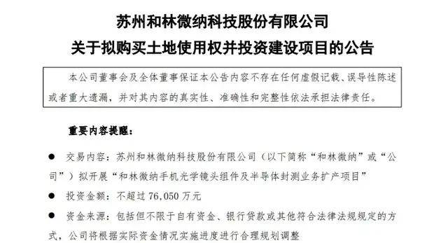 2026年1月5日,苏州和林微纳科技股份有限公司(简称“和林微纳”)发布公告▪,宣布拟投资不超过7.605亿元建设“手机光学镜头组件及半导体封测业务扩产项目”•●,核心聚焦提升半导体芯片测试探针等封测相关产品产能与市场竞争力,以响应高端制造业及半导体产业发展需求。