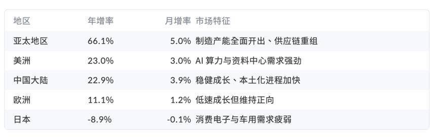 从区域表现来看,亚太地区仍是本轮成长的主要推力■△,11 月销售额年增率高达66.1%,月增5%,增幅居全球之冠,反映制造产能全面开出与供应链重组效应持续发酵。美洲市场年增23%…☆、月增3%▽•,显示AI 算力与资料中心投资热度未退。中国大陆市场维持稳健成长-★=,年增22.9%、月增3.9%。欧洲市场成长相对温和,但仍保持正向-,而日本则是主要市场中唯一出现下滑者,年减8=▽.9%★☆、月减0●•▽.1%。