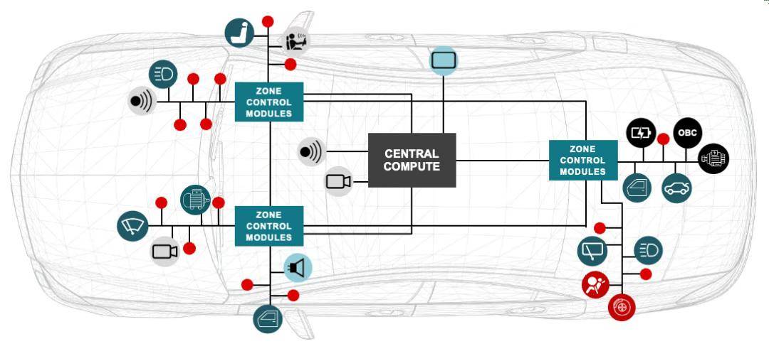 区域控制模块(ZONE CONTROL MODULES)按车身区域(如左前、右后等)分布,是 “中央大脑” 与各类硬件的中间层:连接区域内的传感器(雷达•、摄像头)、执行器(车门、扬声器)、设备(充电模块 OBC、显示屏)◇•○;
