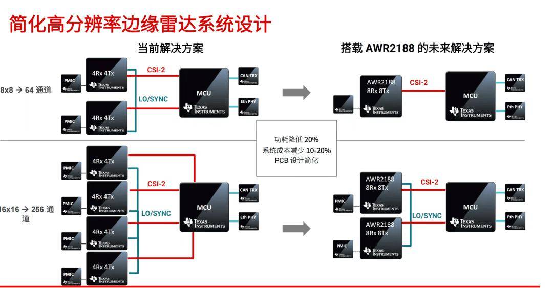 上图展示了高分辨率边缘雷达系统的设计简化方案,核心是用 TI 的 AWR2188 芯片替代原有方案,实现系统优化: