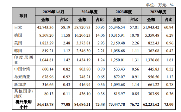此外★◆,公司的大量原材料采购自境外供应商,其中有超过半数采购自日本供应商。报告各期■●,公司境外采购原材料金额分别为6.22亿元▲、7.34亿元、8.47亿元、5.66亿元□,在总采购金额的占比分别为73%、76.72%、73.48%、77▷●.08%。