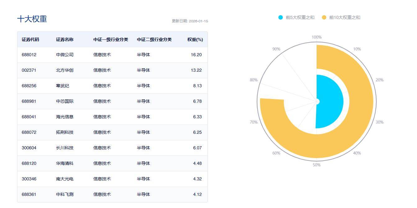 既有像北方华创(全能型设备巨头)、中微公司(刻蚀机领军者)这样的设备底座,也纳入了海光信息、寒武纪等代表中国AI算力最高水平的芯片公司。这种高度集中的持仓结构,使其成为分享半导体设备行业增长的高纯度工具。