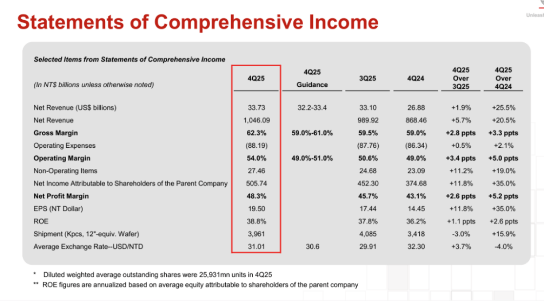 2025年Q4☆•…,台积电营收336.7亿美元(10460.9亿新台币),同比增长25.5%,环比增长5◁◆.7%★◆○。净利润5057.4亿新台币,同比暴增35%,这是台积电连续第八个季度实现利润同比增长••。净利率达48.3%,毛利率62.3%△■。