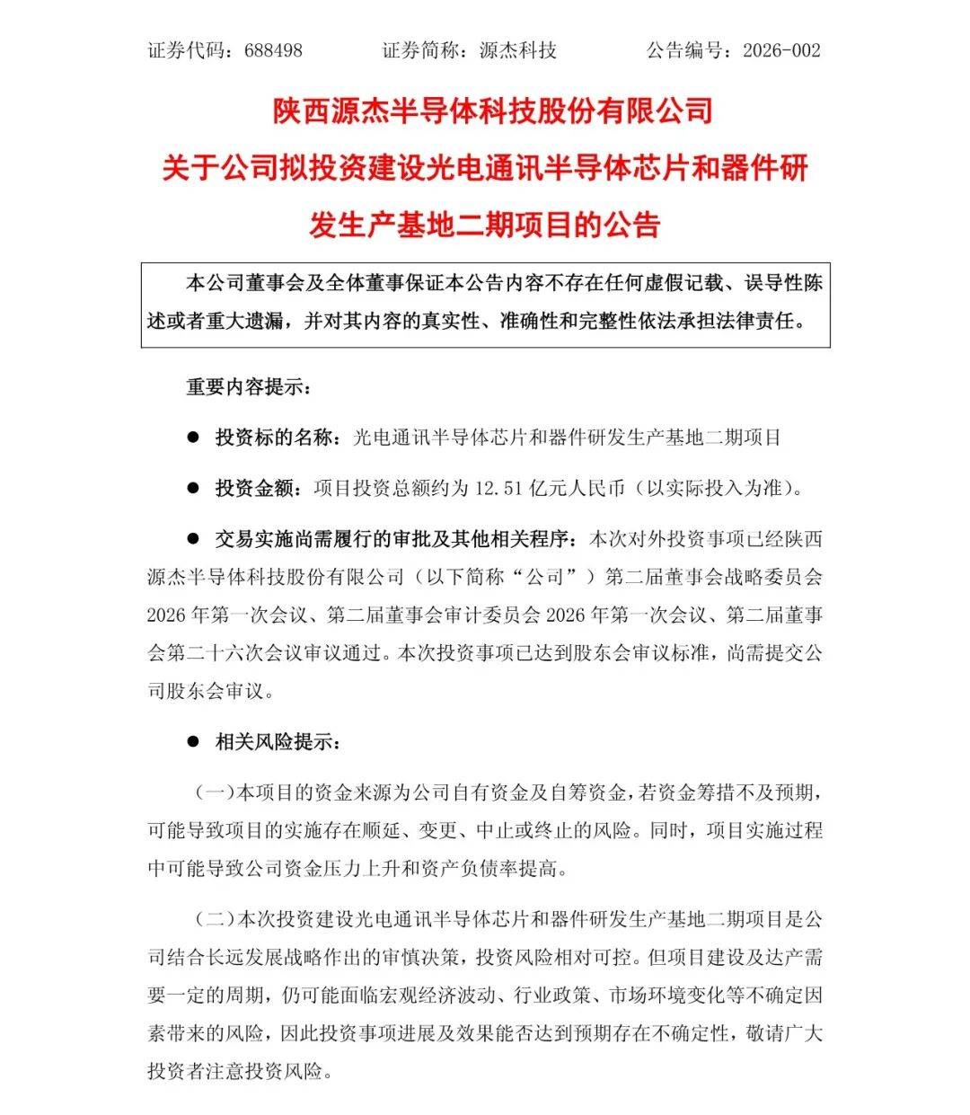 2月9日,源杰科技发布公告称,公司拟投资建设光电通讯半导体芯片和器件研发生产基地二期项目,总投资金额约12.51亿元,资金来源为自有资金及自筹资金,项目尚需提交公司股东会审议通过后正式推进。